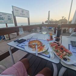 Walked the boardwalk west for half an hour. Had a cheap beer stop (£3) then a wine and some lovely sardines on the beach. Back to the pool for a swim, then across the road for some supplies and aLeia mais