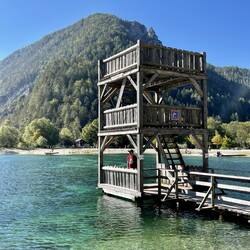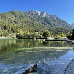 An seinem Ufer steht stolz die Skulptur eines Zlatorog, des Steinbocks mit den goldenen Hörnern, Wahrzeichen von Kranjska Gora.Read more