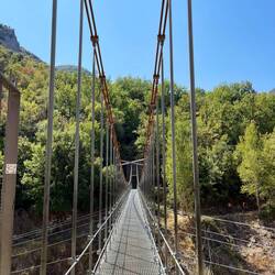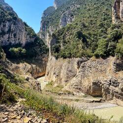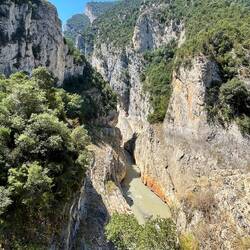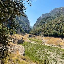 Nachdem wir eine Hängebrücke überquert haben, befinden wir uns nach etwas weniger als einer halben Stunde am Eingang der Schlucht. Die Felswände rücken mit jedem unserer Schritte näher zusammen und ragen immer höher hinauf. Anfangs wachsen einige Büsche und Bäume am Wegesrand.
