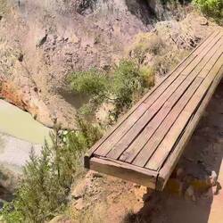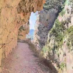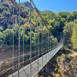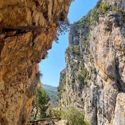 Beinahe eben wandern wir schon bald auf einem Felsband in luftiger Höhe mehr als hundert Meter über dem Fluss. Das ockerfarbene Gestein des überhängenden Felsens bietet etwas Schatten. Neben uns fällt die Felswand senkrecht zum rauschenden Fluss hin ab. Ein Geländer gibt es nicht. Lediglich ein Stahlseil auf Felsseite bietet nicht schwindelfreien Personen Halt. Es ist atemberaubend schön in die Schlucht zu blicken.