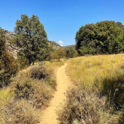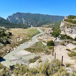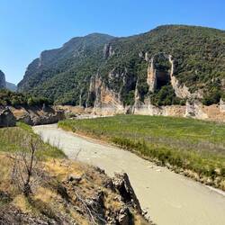 Der Weg in die Schlucht führt nun zunächst über einen breiten, geschotterten Weg. Neben uns liegt der Fluss Noguera Ribagorcana. Wenige gräuliche Gerippe abgestorbener Bäume zeugen davon, dass dieses Gebiet immer wieder überschwemmt wird. Am Fels ist eine ebenfalls gräuliche Linie zu erkennen, die deutlich zeigt, wie hoch das Wasser steigen kann. Vermutlich entspricht dies der Höhe des nahen Stausees.