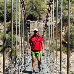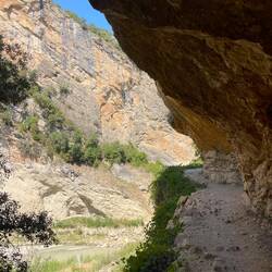 Es war Joe‘s Idee, die knapp 100 km in den Süden zu fahren, um diese grandiose Wanderung machen zu können. Die Wanderung in der Schlucht „Congost de Mont Rebei“ ist definitiv eine der spektakulärsten Wanderrouten auf der gesamten Iberischen Halbinsel. Fast der gesamte Weg verläuft über ein traumhaftes Felsband zwischen den hoch über dem Fluss aufragenden Felswänden. Ein unvergleichbares und am heutigen Tag auch ein unvergleichlich heißes und unvergessliches Erlebnis! Es hat 36 °C, der heiße Wind föhnt uns an. Joe hatte zum Glück die Idee, dass wir uns nasse Handtücher um den Hals und den Nacken binden. Das fühlt sich an wie eine körpernahe Klimaanlage und funktioniert sehr gut. Außerdem haben wir 4 l Wasser dabei und fühlen uns so ganz gut gewappnet.