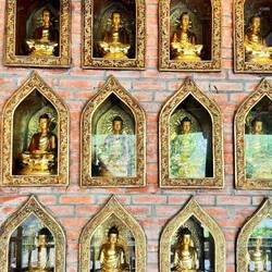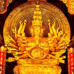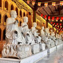 Schon beim Betreten fällt die gewaltige Dimension der Anlage auf. Besonders berühmt ist der überdachte Arhat-Gang mit seinen 500 lebensgroßen steinernen Arhat-Statuen. Arhats sind im Buddhismus erleuchtete Schüler Buddhas, die das Nirwana bereits erreicht haben. Jede dieser Figuren besitzt ein individuelles Gesicht, eine eigene Haltung und einen eigenen Ausdruck – sie verkörpern unterschiedliche menschliche Charaktere, Tugenden und Schwächen und symbolisieren so den spirituellen Weg des Menschen.