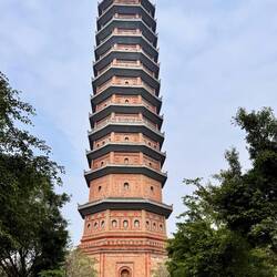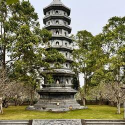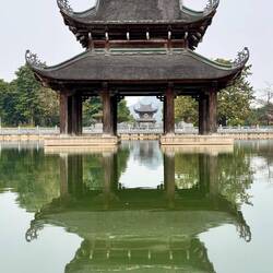 Als letztes erkunden wir den bedeutendsten spirituellen Orte Vietnams, dem Bai-Dinh-Tempelkomplex bei Ninh Binh – eine Anlage, die auf beeindruckende Weise jahrtausendealte buddhistische Tradition mit moderner Monumentalarchitektur verbindet. Schon bei der Anfahrt wird uns klar, hier war ganz Großes geplant. Eine riesige Parkplatz-Anlage liegt brach, es verirren sich nur ganz wenige Touristen hierher, und dennoch müssen wir an einer mit drei Kontrolleuren besetzten Personenkontrolle vorbeifahren, damit wir unseren Roller kostenfrei parken können. Wir bekommen ein Parkticket mit unserem Kennzeichen und der Ankunfts-Uhrzeit (von Hand ausgefüllt versteht sich), das müssen wir beim Verlassen wieder abgeben. Das war’s dann auch schon. Es gibt verschiedene Eintrittsoptionen und wir entscheiden uns für Option 1 (das günstigste Ticket für umgerechnet 3,30 €) und Option 2 für fünf Euro, das auch zum Eintritt in die große Stupa berechtigt. Die Dame der Kasse meinte, dass wir mit 5-6 Stunden Laufzeit rechnen müssten, wenn wir nicht das teurere Ticket nehmen, bei dem wir zwischendurch immer wieder Shuttle Busse verwenden können. Das war reichlich übertrieben, denn am Ende haben wir fast alles gesehen und brauchen nur eineinviertel Stunden, allerdings ohne Pause und zuzüglich der An- und Rückfahrt mit dem E Shuttle, der jeweils alleine schon eine viertel Stunde dauert. Ob man die Anlage gesehen haben muss? Ich weiß es nicht, aber es sind wunderschöne Fotos und Reise-Erinnerungen entstanden, allerdings wirkt alles recht kühl und nüchtern. Ich glaube es fehlt die Authenzität.