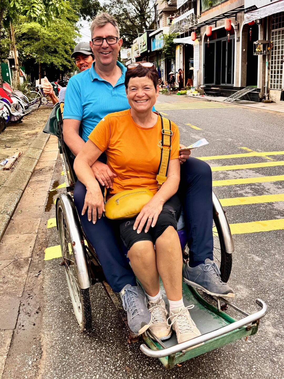 Unser Hotelzimmer ist leider noch nicht bezugsfertig, als wir am frühen Morgen anreisen, daher machen wir uns zu Fuß auf den Weg zur Zitadelle. Als wir am Eingang sind, müssen wir feststellen, dass wir die Rückseite erwischt haben, die nur Einlass für Mitarbeiter bietet. Das bedeutet knapp 2 km außen rumlaufen. Da spricht uns ein Rikscha Fahrer an, er können uns ja auch fahren. Wir lehnen erst ab, doch nachdem ich zweimal ziemlich ausgerutscht bin auf dem noch vom Regen sehr rutschigen Untergrund, entscheiden wir uns schnell um. Wir kommen mit. 150.000 will er für die Fahrt zum Eingang oder wenn wir mögen 400.000, dann zeigt er uns noch ein paar Sehenswürdigkeiten in der Stadt. Okay. Das machen wir!