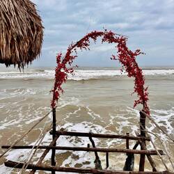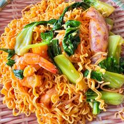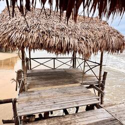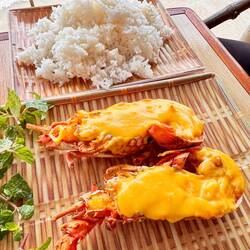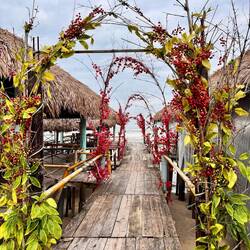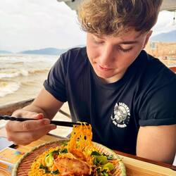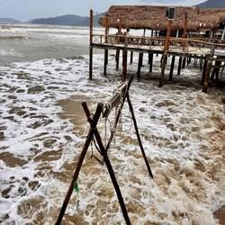 Am Meer entdecken wir schließlich ein Restaurant auf Stelzen – unser Platz fürs Mittagessen. Wir bestellen uns Nudeln mit Meeresfrüchte, gegrillten Tintenfisch und für Maurice einen kleinenLue lisää