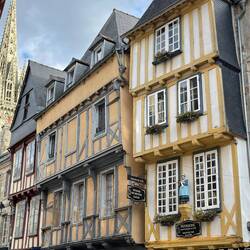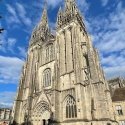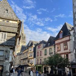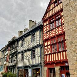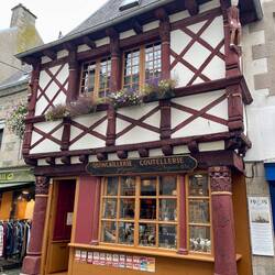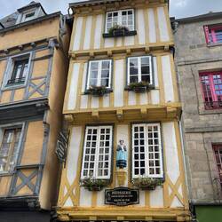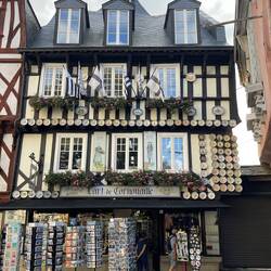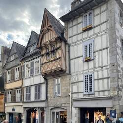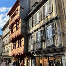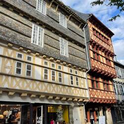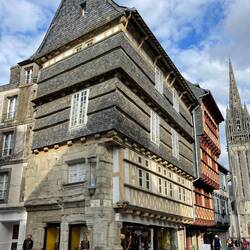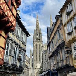 Wir parken ganz zentral und nach 17 Uhr kostenfrei. Was für ein Vergnügen, durch die Gassen des alten Quimper zu schlendern. Überl die Brücken des Odet gelangen wir in die Altstadt. Fachwerk- und Erkerhäuser neigen sich zu den Gässchen.