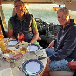 Wir lassen uns den kräftigen Wind um die Nase wehen und bleiben draußen, bis die Sonne im Meer versinkt. Hier ist es zum ersten Mal richtig frisch, fast schon kalt, umso gemütlicher ist es im Wohnmobil bei einem herrlichen Abendessen und leckerem Wein.