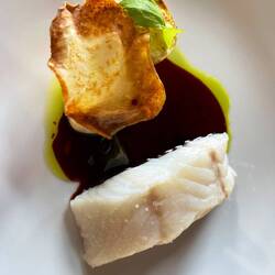 Fisch des Tages mit einer Deklination rund um den Sellerie und säuerlicher brauner Jus mit Rotwein.