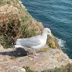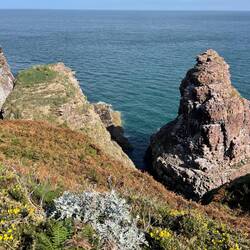 Die über 70 Meter über dem Meer aufragenden Klippen am Cap Fréhel aus Schiefer und rosa Sandstein bieten eine der schönsten Aussichten der Bretagne. An diesem einzigartigen Ort, einem Vogelschutzgebiet, führt uns unsere Wanderung durch mannshohes Heidekraut und Ginster zurück zum Parkplatz.