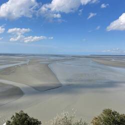 Heute Nacht hat es wieder geregnet und laut Wettervorhersage, wird es erst ab 10:30 Uhr wieder trocken. Stimmt tatsächlich, so verlassen wir unseren kleinen Campingplatz, suchen uns einen kostenfreien Parkplatz zwei Dörfer weiter und machen unsere Räder startklar. Ein Großteil unserer Radtour nach Granville führt uns direkt am Meer entlang, mit kräftigen, auflandigem Wind, der uns vorantreibt. Unterwegs beobachten wir Schwimmer, Wasserläufer - eine hier sehr weit verbreitete Sportart, man wandert im Wasser bis über die Hüften, den Strand hoch und runter, egal, ob mit oder ohne Neoprener, egal ob jung oder alt - Reiter, die den Strand im Galopp entlang reiten und eine Robbe.