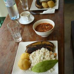 Samuel bestellte für uns eine Auswahl an traditionell ugandischen Gerichten aus Matoke (Kochbanane), Yamswurzel und Kürbis mit Bohnen und Erbsen in Tomatensoße.