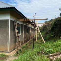 Erholt und ein wenig zu spät dran machten wir uns kurz vor 9 bereit, um von Noorahs Sohn zur Kirche abgeholt zu werden. Aufgeregt auf das, was uns erwartete, setzten wir uns mit ihm auf sein Boda. Es war das erste Mal, dass wir die Community rund um das Projektgebiet kennenlernen sollten. Nach einer Weile auf der großen Straße bogen wir auf einen kleinen Feldweg ab und hielten vor einem großen Gebäude, das aus halb fertig gemauerten Wänden bestand und noch kein Dach hatte. Aus einem kleinen, überdachten Raum daneben hörten wir Geräusche. Wir gingen drei Stufen hinunter und betraten einen kleinen Raum mit 6 Holzbänken und einem kleinen Tisch mit Tischdecke vorne in der Mitte – die provisorische Kirche, die genutzt wird, bis die größere fertig ist.