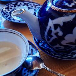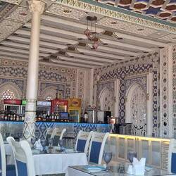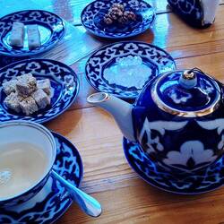 Premier matin à Samarcande (v.a. Samarkand), petit-déjeuner bien sympa dans une ambiance orientale.