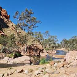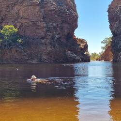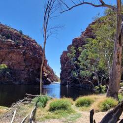 Zuerst ein kurzer Boxenstopp beim Wohnmobil Vermieter, eine paar Kleinigkeiten richten lassen, dann geht's los. Heute waren wir beim Simpsons Gap, dann beim eiskalten Ellery Creek Big Hole und jetztLes mer