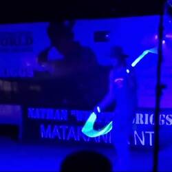 Wir waren jetzt am Abend bei Nathan Whippy Griggs, Weltrekordhalter im Whipp Cracking (Peitschenknallen).