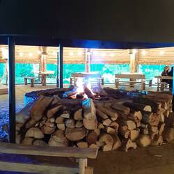 Alles was van hout met een enorme grote tipi in het midden een groot vuur en er speelde s'avonds een DJ