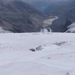 Von der Hütte ging es erst einen Wanderweg durch ein Schuttfeld hinunter, bis wir an einem Grat angekommen sind. Dem mussten wir dann bis zum südlichsten Rand des Hofmannskees folgen über welches wir mit Steigeisen und Pickel zur Hohenwartschatte queren mussten. Dort packten wir das Gletscherzeug wieder ein und folgten einen Klettersteig hinunter. Der Weg führte danach erst über einen mit Steinen bedeckten Blockgletscher und später entlang des Hanges.
