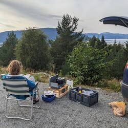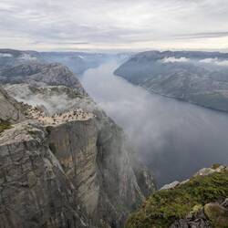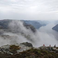 Heute sind wir mit Ausblick auf den Fjord und dicke, tiefhängende Wolken und Nebel aufgewacht.