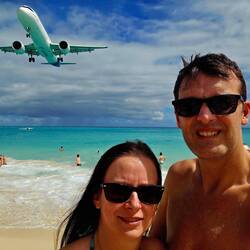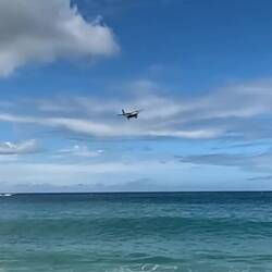 Wir sind am Flughafenstrand von St. Martin. 🏖️✈️ Die Flugzeuge düsen über unsere Köpfe hinweg. 🛩️💨