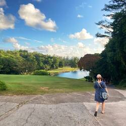 Da wir doch noch gerne baden wollten heute, beschlossen wir in 10 Autominuten an den Strand Anse Georgette zu fahren. Es handelt sich zwar um einen öffentlichen Strand, der Weg dort hin führte aber zu Fuß durch den Golfplatz einer Hotelanlage. Da wir uns noch nicht viel bewegt hatten, kam dieser Spaziergang durch die schöne Anlage genau richtig. Zum Glück lag der Großteil des Weges im Schatten, denn heute fühlte es sich draußen ultra heiß an. Die letzten Tage war es immer so, dass es zwar in der Sonne nicht lange auszuhalten, im Schatten aber angenehm war. Heute schwitzten wir auch im Schatten selbst wenn wir uns nicht bewegten und empfanden es als unangenehm. Am Morgen hatte es auch geregnet, es könnte auch an der höheren Luftfeuchtigkeit liegen.