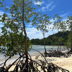 Im Anschluss liefen wir entlang eines Pfades, der auf die andere Seite der Insel führte. Der Pfad beinhaltete den längsten Boardwalk der Seychellen. Schnell wurde uns klar, wieso es ein Boardwalk war - der Weg verlief quer durch ein Mangrovensumpfgebiet. Spannend, hier konnten wir ganz neue Tierarten, vor allem jede Menge Krabben, aber auch einige Bronze Geckos und Schlammspringer sehen. Und natürlich die beeindruckenden Mangroven.