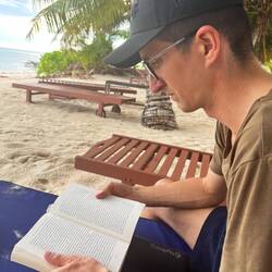 Nachdem im Apartment alles verräumt, und wir eine kurze Siesta gemacht hatten, ging es los zu unserem ersten Strand auf La Digue, dem Anse Patates. Und was soll ich sagen… traumhaft schön! Ein kleiner Sandstrand mit Granitfelsen und Palmen. Nur verhältnismäßig viele Leute. Schwer einen Platz im Schatten zu finden, war es trotzdem nicht. Tom ist einmal ins Meer gesprungen und musste feststellen, dass man das wohl besser mit Wasserschuhen machen sollte. Daran denken wir morgen. Ich habe mein Fitzek Buch weiter gelesen.