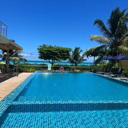 Inzwischen war es schon Nachmittag und wir hatten Lust auf einen Kaffee. Das scheint auf den Seychellen gar kein so großes Ding zu sein. In einem Restaurant ging die Kaffeemaschine gar nicht, im zweiten musste sie erstmal angemacht und gespült werden bevor unser Kaffee rausgelassen werden konnte. Naja, Hauptsache wir hatten dann einen. Nach weiteren 20 Autominuten waren wir wieder zurück im Hotel, wo wir uns den Rest des Nachmittags an den Pool legten, Buch laßen und ein wenig plantschten. Herrlich.