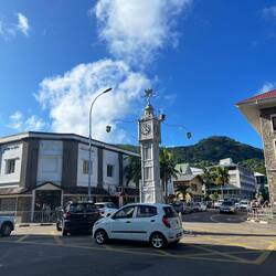 Angekommen auf Mahé hatten wir noch einige Stunden bis zu unserem Flug zu überbrücken. Also schlossen wir unser Gepäck ein und liefen einen knappen Kilometer in die Hauptstadt der Seychellen, Victoria. Leider hat das Nationalmuseum montags geschlossen, das wäre noch interessant gewesen. Wir spazierten ein wenig herum, sahen den viel von Autos umfahrenen Uhrenturm, zwei Kirchen und einige kleine Läden. Ein Eis musste zum Schluss des Urlaubes dann auch noch sein. War sehr lecker.