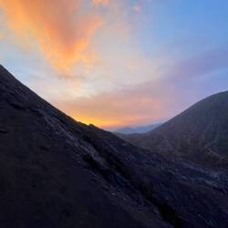 Und als ob die Schönheit des Tages noch nicht genug gewesen wäre, wurden wir beim Abstieg noch mit einem pinken und unwirklichen Sonnenuntergang belohnt, der in starkem Kontrast mit dem Grau und Schwarz des Vulkans so wie der Ebenen stand.