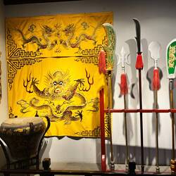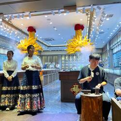 The large floral display represents the 56 ethnic groups of China. The largest is the Han Chinese, numbering 900 million people, who reside in every region of the country. The smallest group is the Hezhen, living in the far northeast, with fewer than 2,000 people.