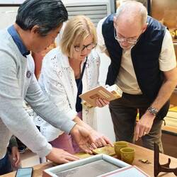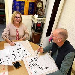 We visited many of the gift shops including of course the chocolate one where we sampled some chocolate delights and some very good hot chocolate. The large displays were very impressive which are preserved with a special coating every couple of months, and monthly in the summer time. After a wander around the shops we arrived at our calligraphy lesson which was held in a local home; Phil was pretty good, whereas Catherine took a bit of practice! The Calligraphy we finished represented home, peace and happiness.