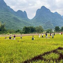 Of course as we have found out during our trip there is always something happening no matter where you go in China; we cycled past day trippers on the river perched precariously on bamboo rafts, youngsters on the fields taking photos in traditional costume (we joined in of course), small improvised cafe stops, and locals tending to their allotments; these allotments were clearly very important - they were all in good condition, and we could see many working on rice, sweet potato, even sugar cane. Boon told us that the land had been allocated to them by the government, on the condition that the produce was for personal consumption or bartering, and could not be sold.