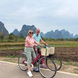 We had a good lunch on board, which was just as well, because when we disembarked in Yangshou there was to be no break for us - we walked through the town and markets to be shuttled to our bike rental, and then we were speeding off through the idyllic countryside next to the Yulong River (speeding off = a gentle pace!).