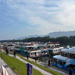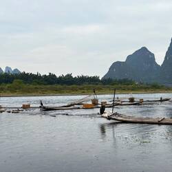 After a breakfast at our hotel overlooking the Elephant Rock, we drove to the terminal to start our Li River cruise from Guilin to Yangshou. We were surprised at the number of boats moored up - they were moored up 4 deep, and there must have been around 20 boats, all medium sized; the Li River cruise is very popular with domestic tourists.