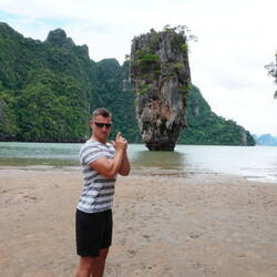 Jeśli w pobliżu są jakieś plany filmowe, to my też chcemy je zobaczyć. Ponieważ podróżowaliśmy i ponownie przybyliśmy w strugach deszczu, nie mieliśmy zbytniej nadziei, że uda nam się wyruszyć na wycieczke, A nawet byliśmy szczęśliwi, że nic nie zarezerwowaliśmy. Następnego ranka... wielkie zdumienie... bez deszczu! Zarezerwowaliśmy więc transfer do skały Jamesa Bonda, samochodem i łodzią, za 50 € poprzez kontakt gospodyni. Ludzie wokół nas nie byli w stanie zrozumieć angielskiego, ale zawieziono nas do portu pick-upem i poprowadzono do łodzi ze słowami: „This is your Captain”.