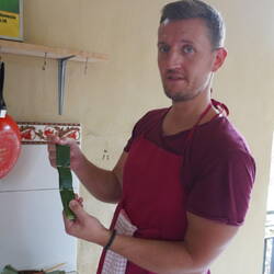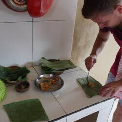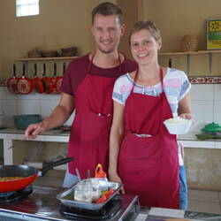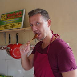 Lekcje gotowania na Bali. Powiedziano nam, że kuchnia balijska bardzo różni się od kuchni indonezyjskiej. Generalnie nie jesteśmy tak entuzjastycznie nastawieni do jedzenia tutaj, ale mamy nadzieję, że jeśli zrobimy lekcję gotowania, przekona nas to o wiele bardziej. Hmm...z jednej strony wszystko jest znowu ostre, zupełnie nie mogę tego znieść. Z drugiej strony podczas gotowania należy wziąć pod uwagę wiele drobnych kroków, które niestety zostały nam podjęte w trakcie kursu, co nieco komplikuje i odbiera radość. Staraliśmy się brać w niej udział najlepiej, jak się dało, a ja próbowałem jeść to, co nie było ostre, to nie było tak dużo. Ale jeden lub drugi może dobrze smakować, jeśli zmienimy go według naszych upodobań. Ale małe zielone kuleczki z cukrem kokosowym są super smaczne, postaramy się je naśladować. Powiem to głośno: najlepsze jedzenie, jakie mieliśmy podczas podróży, było w Stambule i Tajlandii.