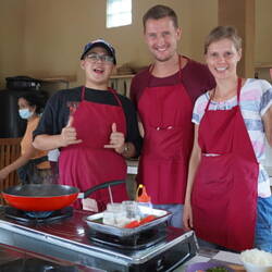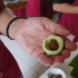 Cooking class in Bali. Balinese cuisine is very different from Indonesian cuisine, we were told. In general, we're not that enthusiastic, but we hope that if we do a cooking class, it will convince us a lot more. Hmm...on the one hand, everything is sharp again, I can't stand that at all. On the other hand, there are many small steps to consider, which unfortunately were taken from us in the course, which makes everything a bit complicated and takes the fun out of it. We tried to participate as well as we could and I tried to eat what wasn't spicy, it wasn't that much. But one or the other could taste good if we change it to our liking. But the little green balls with coconut blossom sugar are super tasty, we'll try to imitate them. Let me say it out loud: The best food we had on the trip was in Istanbul and Thailand.Læs mere