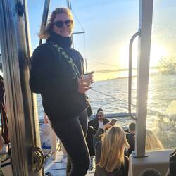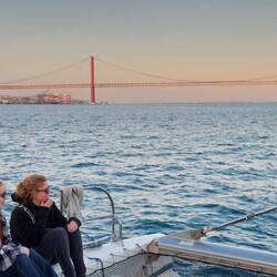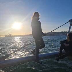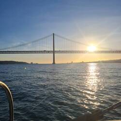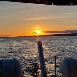 Sonnenuntergang auf dem Katamaran, es war wunderschön, jetzt lassen wir den abend noch nett mit ein paar neuen Leuten bei einem Weinchen auf der dachterasse ausklingen gute Nacht lissabon 😎