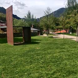 The 1st picture is a look at the countryside of the Campo. The 2nd and 3rd pictures are in El Palomar. The leaning stature of the tree refers to the annual village festival where a tree is cut and set up, roughly the equivalent of a maypole in the UK. The silhouette cutouts reflect some of the festivities.