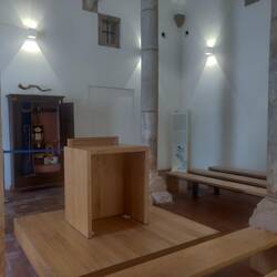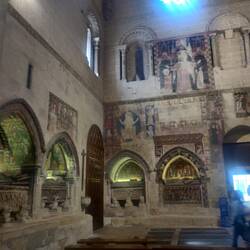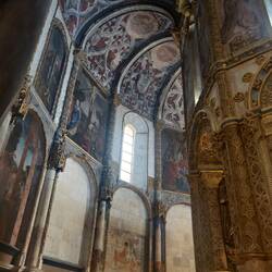 The 1st picture is from the outside. You can see the round section to the right which was the original part of the church. In order to build suspense gradually, I'll start with the later, rectangular addition. It contains 2 choirs: the upper in the 2nd picture and the lower, directly below the upper, in the 3rd. The low window in the 2nd picture below the upper choir opens on the lower choir. The entry to the church is in the rectangular space between the choirs and the main, original, part of the church. The 4th picture is a small side chapel off the main church.