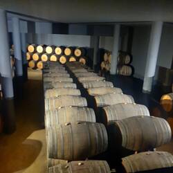 I'm told that many of the producers here still crush the grapes in the traditional way, by foot. At Quinta do Seixo, crushing is done robotically in the vats in the 8th picture. The mechanism is visible at the rear of the picture. The 9th picture is some port aging in oak barrels in their cellar. The last picture is the Sandeman logo. I'm told that the silhouette is intended to reflect both Spanish and Portuguese tradition as the business began with sherry in Spain and expanded to port.Read more