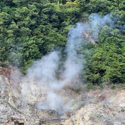 Okay, es war ein vulkanisch aktiver Ort, welchen wir besuchten. Allerdings stellt man sich landläufig unter einem Vulkan etwas anderes vor. Es rauchte ein wenig aus der Erde und es gab mehrere Löcher, in denen graues Schlammwasser kochte. Dazu roch es nach Schwefeldämpfen, welche bekanntlich sehr viel Ähnlichkeit mit dem Geruch von faulen Eiern haben. Das war es dann aber auch schon. Für die Exkursion wurde uns ein(e) Guide(din) oder Guidine? zugewiesen, welche uns viel wissenswertes über das Vulkangebiet erzählt hat. Unter anderem auch, dass jener alle 250 Jahre ausbrechen würde und er jetzt bereits seit einigen Jahren „überfällig wäre“. Wir sollten uns aber keine Sorgen machen, solange sie da sei, ist alles sicher. Wenn sie jedoch anfangen sollte wegzulaufen, dann mögen wir ihr bitte einfach folgen…