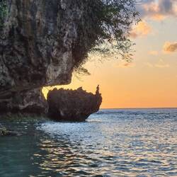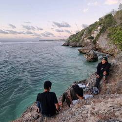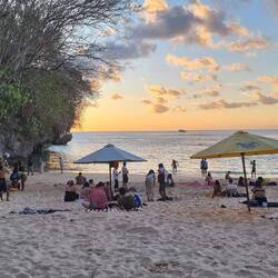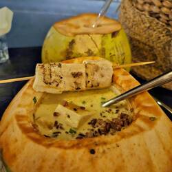 Weiter aber mit unserer Tour... Nach Kuta führte unser Weg zunächst weiter nach Pecatu, direkt an den bekannten Surf-Strand Padang Padang. Von dort wollten wir Ausflüge zum Uluwatu Tempel machen, Surf Unterricht nehmen, usw. und haben uns dafür in einem süßen Surfcamp (Bombora Surf Camp) eingemietet. Am Anreisetag gab's für uns neben dem schönen Sonnenuntergang am Strand, noch einen Besuch in einem indonesischen Restaurant, in dem das Essen, zu meiner Freude, in einer Kokosnuss serviert wurde.