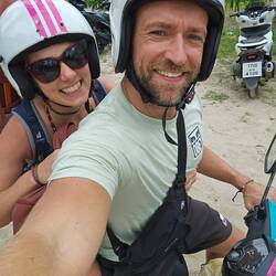 Einen weiteren Tag verbrachten wir damit, mit geliehenen Roller ein Stück weiter in Richtung Norden zu fahren. Unterwegs entdeckten wir ein wunderschönes Plätzchen am Strand, an dem wir eine Zeit lang verweilten. Neben leckerem Essen und kühlen Getränken, gab's hier ne wunderschöne Badestelle. Das Wasser war super erfrischend und um uns herum hatten auch einige Einheimische ihren Spaß im kühlen Nass. Ansonsten ging es mit den Rollern noch zu zwei sehr beeindruckenden Tempelanlagen. Unfassbar schön, wie detailreich die Tempel gestaltet sind.
