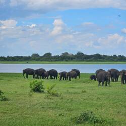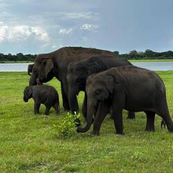 Mit seinem Jeep fuhren wir durch den Park und konnten riesige Elefantenherden in freier Wildbahn beobachten. Gelegentlich trafen wir aber auch auf einzelne Bullen, Adler, Pfauen und viele heimische, bunte Vögel, Affen, Chamäleon und lustige Tiere, die aussahen wie eine Mischung aus einem kleinen Murmeltier, einem Marder und einer Ratte. Besonders angetan hatten es uns die vielen Babyelefanten. Die waren wirklich zuckersüß! Amila ließ uns Zeit, die Tiere ausgiebig zu beobachten und versorgte uns mit allen nötigen Infos. Damit auch er was davon hatte, mussten wir einen kurzen mini Werbespot für sein 'Safari-Unternehmen' drehen. "Lady, please put your sunglasses on, watch around and after you spotted the elephants put the glasses off and try to be super excited! Than Sir, you have to zoom close to the elephants."