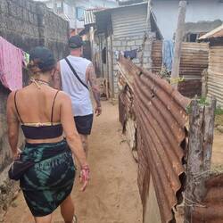 Als uns der Weg am Strand entlang durch Felsen versperrt wurde, mussten wir in einen Slum ausweichen, dessen Aussehen von Blechhütten mit Planendächern, zerfallenen Steinmauern und Müll geprägt war.