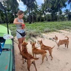 Durch die regelmäßigen Besuche lernte die kleine sehr schnell, dass ich ihre Futtertante bin und brachte mir immer mehr Vertrauen entgegen. Die Jungs unterstützten mich tatkräftig, indem sie das Rudel beschäftigen. Irgendwann klappte es auch ohne Ablenkung und so hatte Mirko andere Touristen zum Unterhalten gefunden, die von unserer Rettungsmission sichtlich angetan waren. Währenddessen spielten Rico und Wiz Fußball am Strand, und ich sorgte mich um die kleine Hündin.