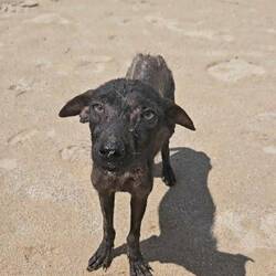 Am nächsten Tag ging es für einen 'Kaffee am Strand' also wieder zur Bar. Auch das Schattenwesen war wieder da. Kaum sichtbar lag es unter einem Sonnenstuhl in einer Kuhle - geschützt vor Sonne, anderen Hunden und Menschen. Bei Tageslicht erkannten wir, es war zu großen Teilen nackt, hatte überall kleine Blessuren und war gruselig dünn.