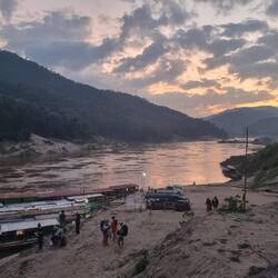 Am nächsten Morgen ging es für uns früh zum Boot. Dieses war bereits etwas in die Jahre gekommen und so lang, dass es so wirkte, als könnte es jeden Moment in der Mitte durch brechen. Die Sitze waren ausrangierte Autositze. Das machte das Ganze sehr bequem und optisch erfrischend anders. Wie der Zufall es wollte, befanden sich unsere Plätze direkt neben Kim's und Joi's. Neben der Tatsache, dass unsere Plätze ziemlich gut waren, hatten wir also auch noch beste Gesellschaft. Nach ca. sieben Stunden auf dem Wasser, kamen wir dann pünktlich zum Sonnenuntergang am Übernachtungsspot in 'Pakbeng' an. Außer einem Abendessen und einem letzten Fruchtsmoothie mit Kim und Joi, fand dann nicht mehr viel statt.